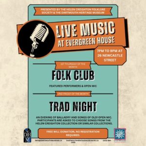 On FRIDAY, JANUARY 9, 2026, the Helen Creighton Folklore Society presents TRAD NIGHT, an evening of balladry and songs of old at Evergreen House.